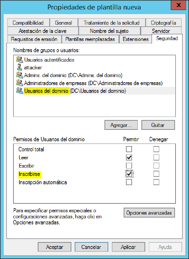 Este problema ocurre al crear o modificar una plantilla de certificado en certsrv.msc o al configurar los “Permisos de inscripción” en Usuarios y equipos de Active Directory (ADUC). El error radica en permitir que el grupo Usuarios del dominio se inscriba en la plantilla o en otorgar permisos de “Inscripción” o “Inscripción automática” a todos los miembros del grupo.
