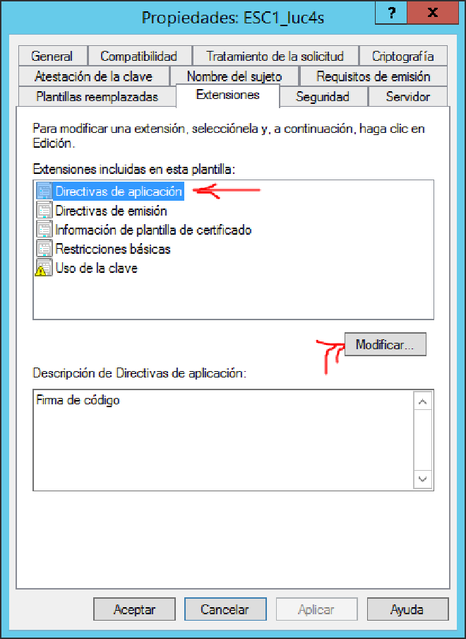 Ahora nos vamos a la solapa de Extensiones, seleccionamos la directiva de aplicaciones y le damos a modificar