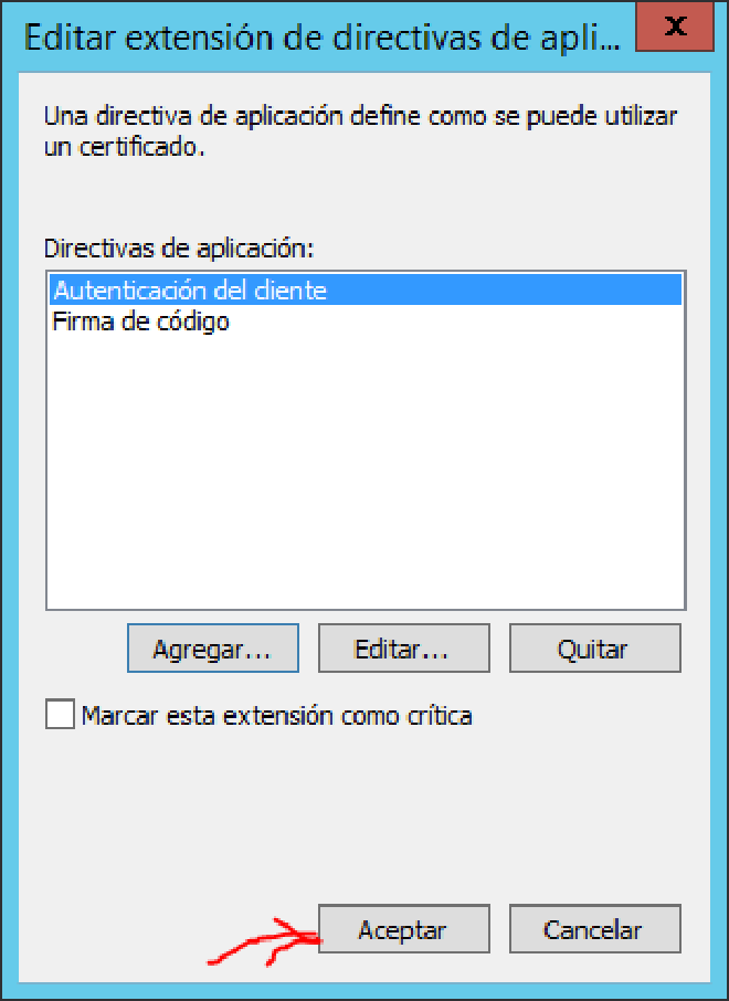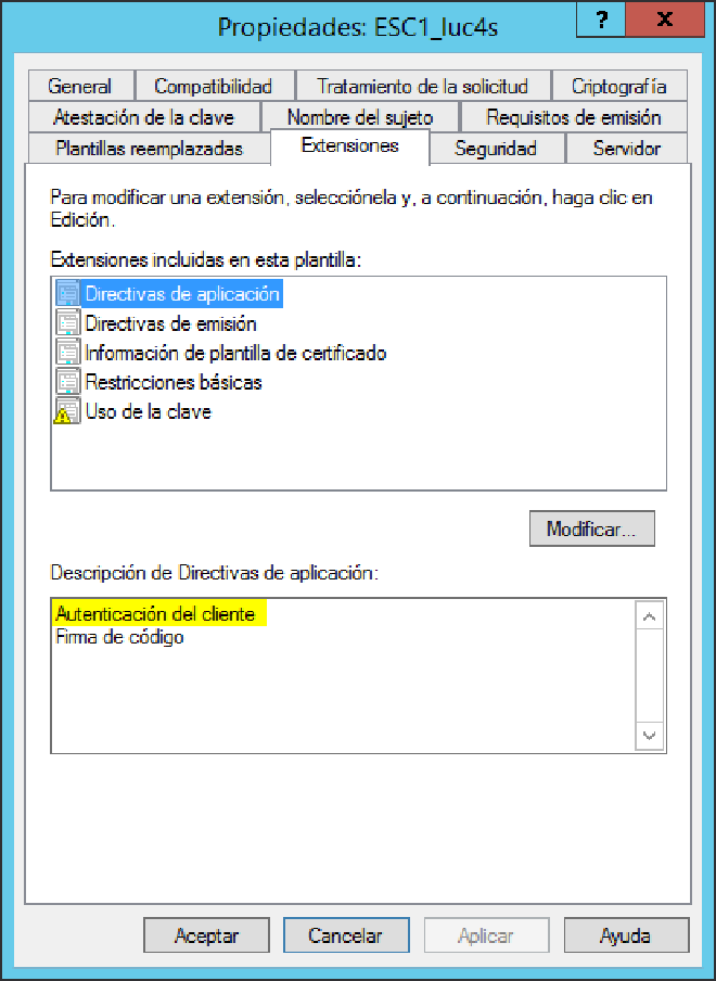 Dentro de las politicas debemos seleccionar Autenticacion del cliente justamente esta politica es la que esta asociada a la vulnerabilidad ESC1 si no se controlan los permisos