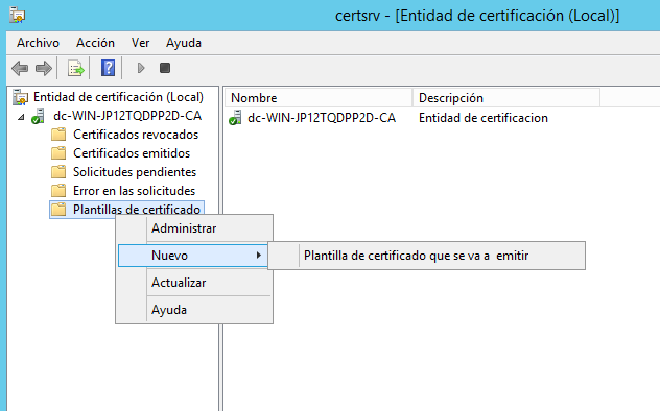 Ya configurada la plantilla, debemos publicarla en el certificado.Regresamos a la ventana de la Autoridad de Certificación (certsrv.msc). Hacemos click con el botón derecho en Plantillas de Certificado → Nuevo → Plantilla de Certificado para Emitir.