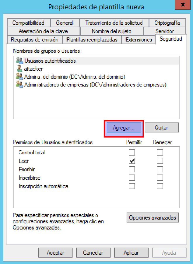 Navegamos a la solapa de seguridad, donde pdemos ver los usuarios y grupos.En este caso modificaremos los permisos del grupo Usuarios del dominio para que cualquier usuario pueda solicitar un certificado.Para ello picamos en Agregar