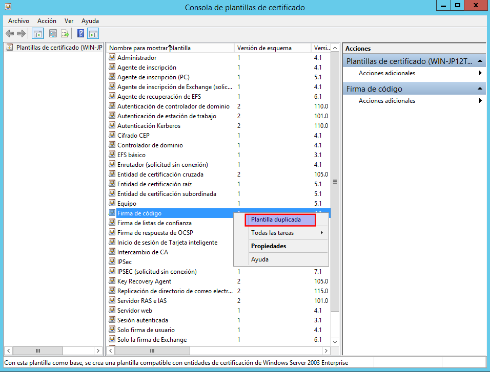 Veremos varias plantillas de certificados, Duplicaremos la plantilla Firma de Codigo