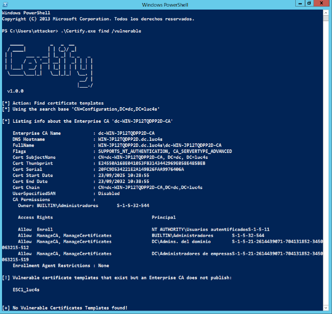 Esta configuración hace posible el ataque ESC1, donde un usuario con pocos privilegios puede solicitar un certificado para una cuenta privilegiada, autenticarse usándolo y escalar privilegios.