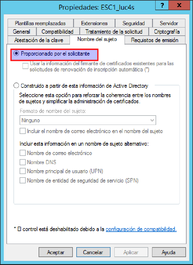 Este problema ocurre en la Administración de Plantillas de Certificado (certtmpl.msc), en la configuración de Gestión de Solicitudes de la plantilla. El error radica en que la opción Incluir en la solicitud permite a los usuarios especificar cualquier Nombre Alternativo del Sujeto (SAN), lo que permite a los atacantes solicitar certificados para cuentas de administrador, de dominio o de servicio.