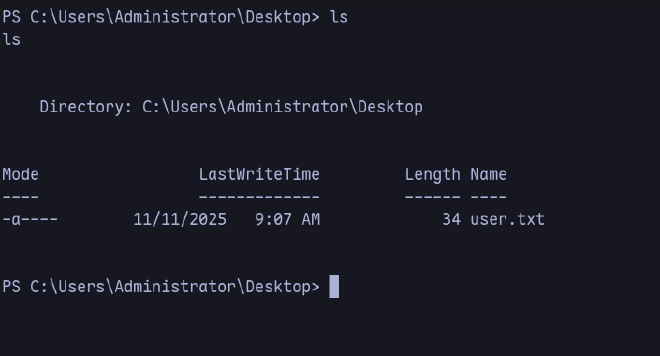 *Evil-WinRM* PS C:\Users\Administrator\Desktop> ls