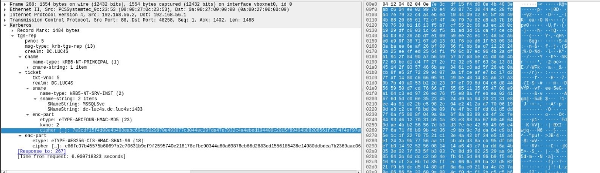 Al capturar el tráfico con wireshark durante una petición Kerberos, es posible obtener el cipher en bruto ,dentro de la respuesta TGS-REP